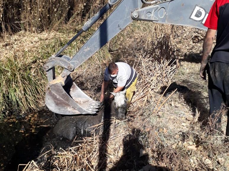 El hecho ocurrió este viernes en la mañana, en calle López, entre 7 y 8, en Pocito. Según las fuentes, el animal se atascó en el barro y llevaba varias horas en el lugar, intentando salir pero era en vano debido a la profundidad del canal.