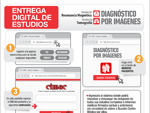 Cimac posee un novedoso sistema de entrega Digital del estudio al paciente. Esto implica que el médico derivador puede observar las imágenes inmediatamente luego de terminado el estudio desde su Pc. De este modo el paciente además cuenta con archivo histórico de los estudios de diagnostico por imágenes que realice en nuestra institución al mismo tiempo facilita el trabajo comparativo de estudios al medico derivante.