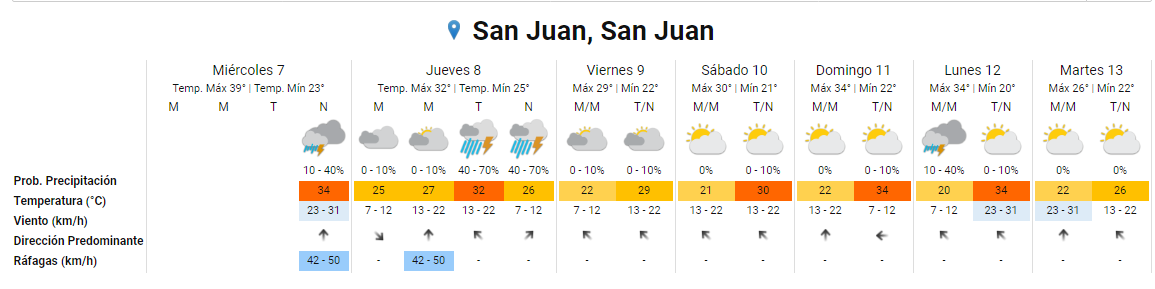 Nubosidad variable y viento predominante del sector Sur será la combinación para que haya un ‘alivio térmico’ en San Juan al menos hasta el martes de la próxima semana. El domingo y lunes se presentan como los más calurosos a priori, con 34 grados, mientras que el más fresco será el día siguiente, con una máxima pronosticada de 26 grados.