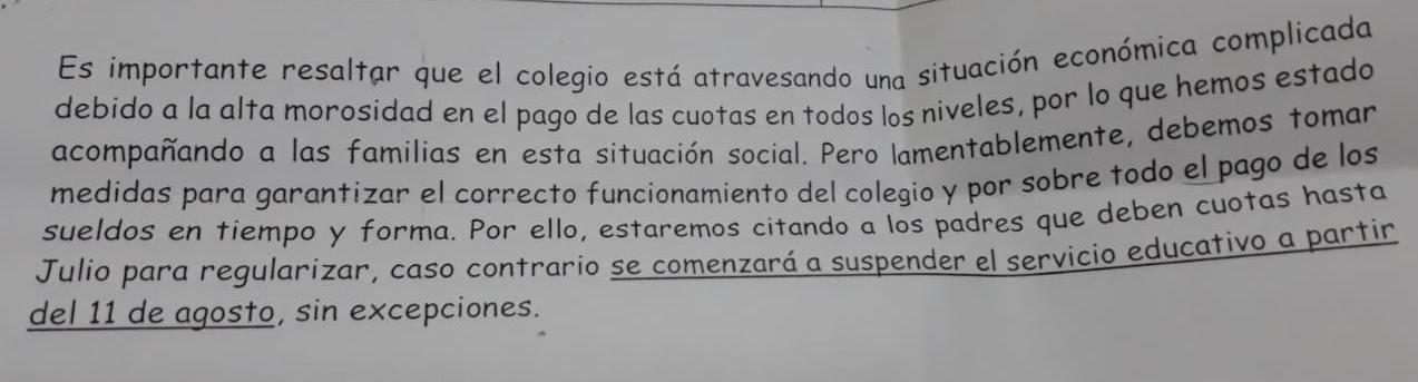Aunque desde el Ministerio no tienen antecedentes de otro caso similar, una institución, sin subsidio del estado y ubicada en Capital, avisó a los padres de sus alumnos que “suspendería el servicio educativo” desde el 11 de agosto a quienes no saldaran sus deudas.