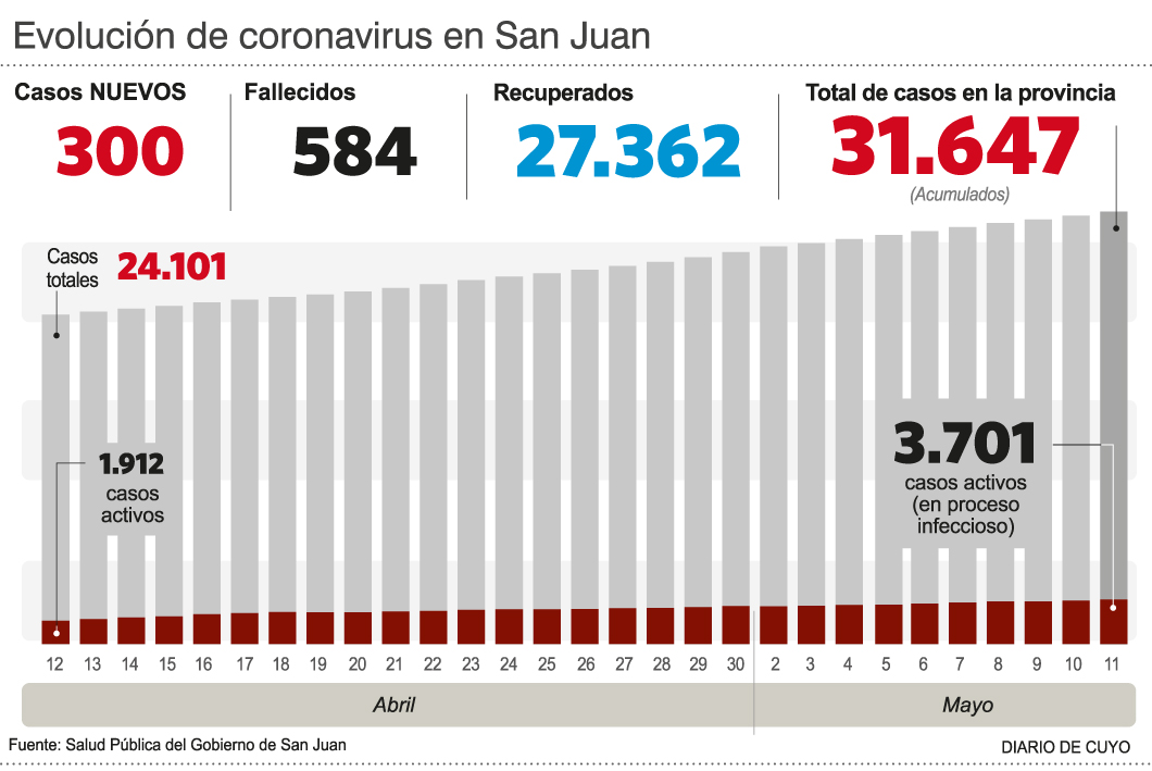 Por su parte, hubo dos nuevos decesos, una mujer de 86 años (ver aparte) y un hombre de 59 años, de Santa Lucía, internado en el hospital Marcial Quiroga. Así, el total de fallecidos es de 584 personas.