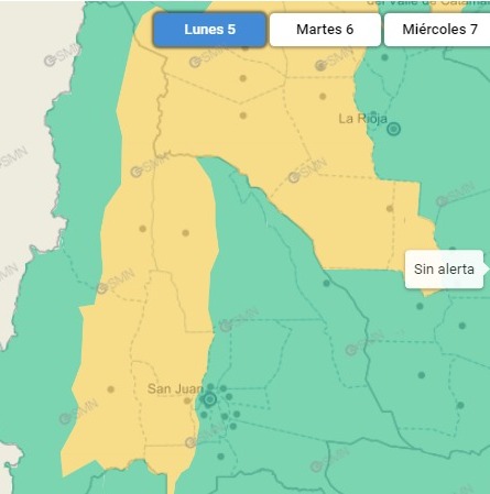 Según indica el informe, parte de Calingasta, Ullum, Zonda, Sarmiento, Rivadavia y Pocito se verá "afectada por tormentas, algunas localmente fuertes. Las mismas podrán estar acompañadas por abundante caída de agua en cortos períodos, ocasional caída de granizo, actividad eléctrica frecuente y ráfagas de hasta 70 km/h. Se prevén valores de precipitación acumulada entre 15 y 35 mm, pudiendo ser superados en forma puntual".