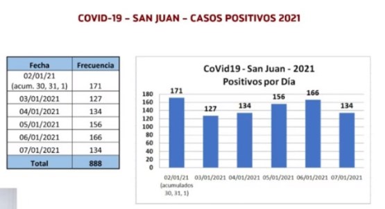 Para finalizar con el resumen, Jofré se refirió a los números de casos positivos de Covid registrados en la provincia durante la primera semana epidemiológica del 2021. Sostuvo que, "desde el 2 de enero hasta ayer 7 de enero los nuevos contagios suman 888".