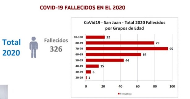 Al referirse a la cantidad de decesos ocurridos como consecuencia del coronavirus en 2020, Jofré comentó que fallecieron 326 personas en San Juan, la mayoría de ellos de entre 70 y 79 años. Y que, en este caso, la semana epidemiológica más trágica fue la 48, cuando se registraron 39 muertes.