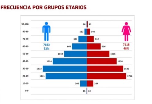 Las autoridades dieron a conocer también la distribución de casos según el sexo y el grupo etario. Indicaron que, de los contagiados, el 52% fueron varones y el 48% mujeres.