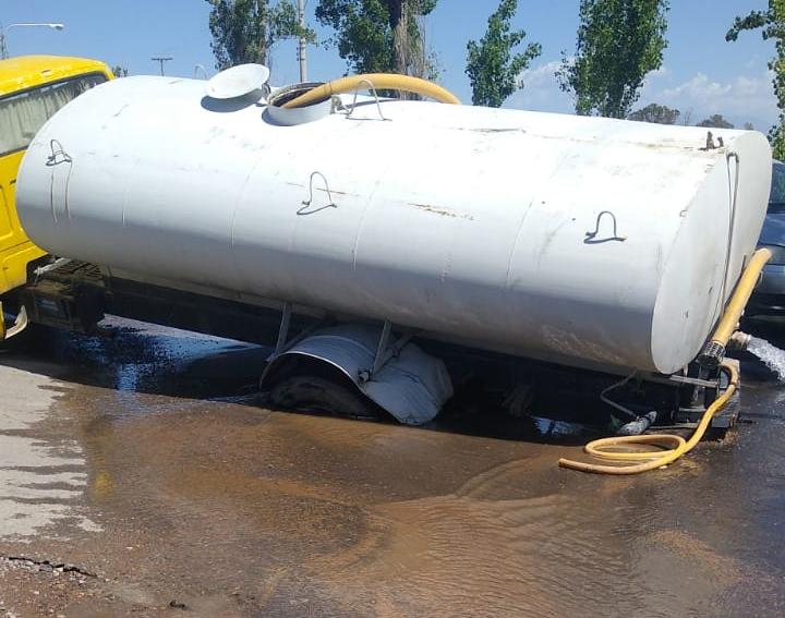 Vecinos de Pocito quedaron asombrados esta mañana, cuando un camión cisterna literalmente se hundió en medio del pavimento.