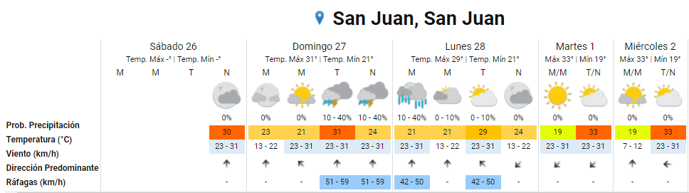 Siempre soplando desde el sector Sur, la temperatura máxima prevista para este día en el Gran san Juan será de 31 grados. A partir del mediodía, el soplido acelerará hasta los 30 kilómetros por hora y durante la tarde y noche pueden haber ráfagas superiores a los 50 kilómetros por hora.