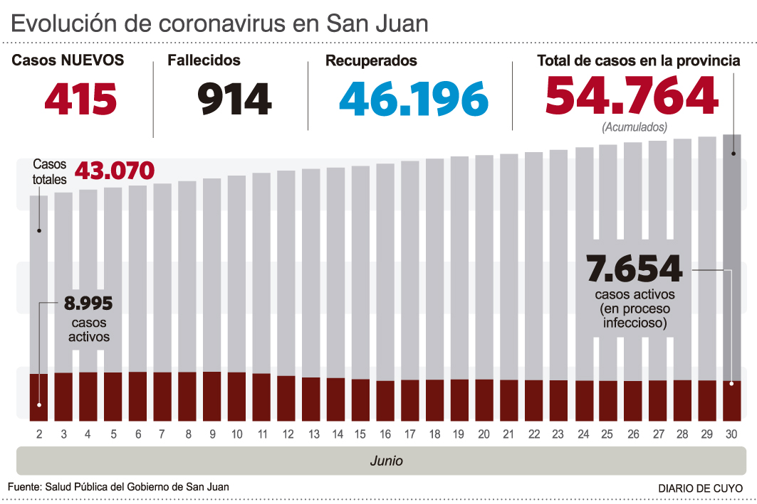 Desde que en el segundo tramo de marzo comenzaron a subir los casos y en abril se disparó la curva de contagios, la provincia no había generado una baja en la cantidad de infectados. Fue en la segunda quincena de junio que se produjo este freno y por eso el mes que acaba de concluir no se convirtió en el peor de la pandemia, aunque quedó muy cerca de mayo. De acuerdo a las estadísticas oficiales, junio registró 13.012 positivos de covid y representó una disminución del 0,5% con respecto a mayo, que sumó 13.081. Sin embargo, mientras disminuyeron levemente los casos hubo un aumento en los decesos: junio acumuló 199 fallecidos y es, lejos, el mes más trágico en San Juan.