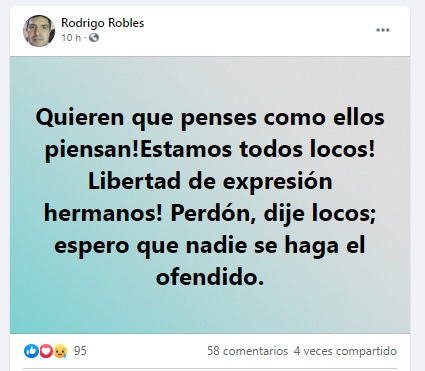 Luego de la catarata de comentarios que recibió, decidió borrar la publicación, aunque sin mostrar arrepentimiento por sus dichos. "Quieren que pensés como ellos piensan. Estamos todos locos" Libertad de expresión hermanos" Perdón, dije locos: espero que nadie se haga el ofendido", siguió.