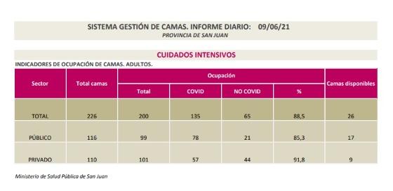 Además, hay internados 296 pacientes en las áreas de COVID-19 (entre positivos y sospechosos) de los hospitales Dr. Guillermo Rawson; Dr. Marcial Quiroga; Dr. Ventura Lloveras, de Sarmiento; Dr. César Aguilar, de Caucete; Dr. José Giordano, de Albardón; Dr. Federico Cantoni, de Pocito; CEMEC; Dra. Julieta Lanteri; Hospital San Roque, de Jáchal; Hospital Dr. Alejandro Albarracín, de Valle Fértil; Hospital de Barreal, de Calingasta; Hospital Privado; Instituto Médico; Clínica El Castaño; Clínica Santa Clara; Sanatorio San Juan y CCI.