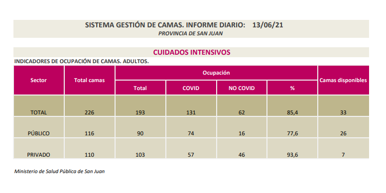 Además, se encuentran internados 270 pacientes en las áreas de COVID-19 (entre positivos y sospechosos) de los hospitales Dr. Guillermo Rawson; Dr. Marcial Quiroga; Dr. Ventura Lloveras, de Sarmiento; Dr. César Aguilar, de Caucete; Dr. José Giordano, de Albardón; Dr. Federico Cantoni, de Pocito; CEMEC; Dra. Julieta Lanteri; Hospital San Roque, de Jáchal; Hospital Dr. Alejandro Albarracín, de Valle Fértil; Hospital de Barreal, de Calingasta; Hospital Privado; Instituto Médico; Clínica El Castaño; Clínica Santa Clara; Sanatorio San Juan y CCI.