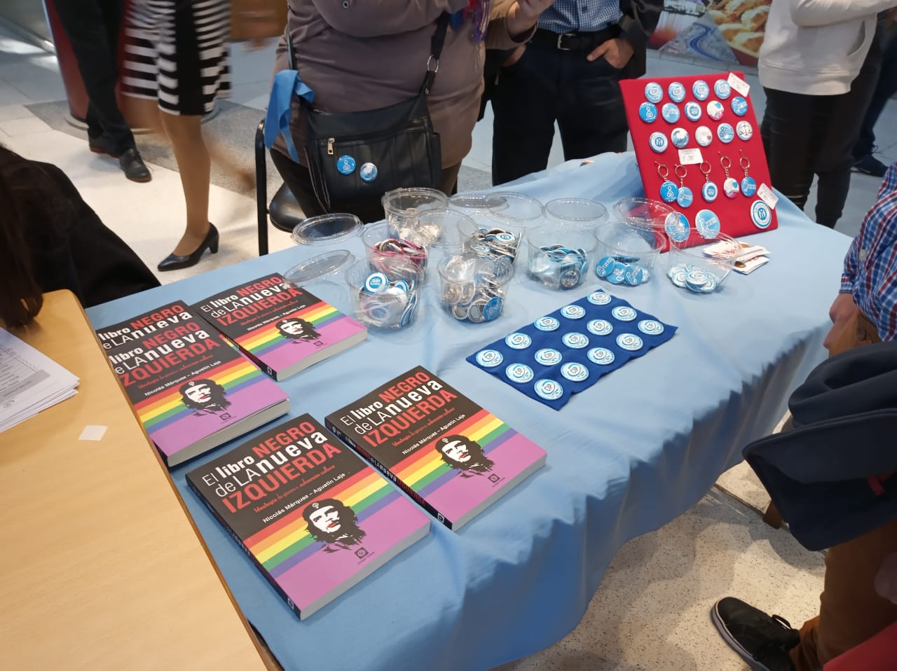 Pañuelos, camisas, corbatas, sweaters, del claro color celeste inundaba el evento organizado por La Ola Celeste San Juan. En el sector destinado a las acreditaciones, se sumaba el somero merchandising oficial. Pines de la agrupación organizadora, otros con la clásica inscripción de las dos vidas y el Libro Negro de la Nueva Izquierda, una insignia de quienes ellos consideran su disertante estrella, Laje.