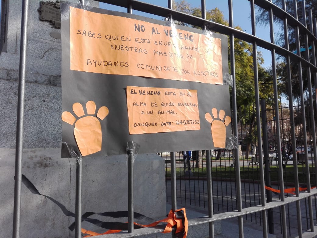 La Plaza 25 de Mayo amaneció cubierta de carteles y cintas naranjas que buscan concientizar sobre el maltrato animal y animar a la gente a que denuncie aquellos casos de envenenamiento de animales callejeros.