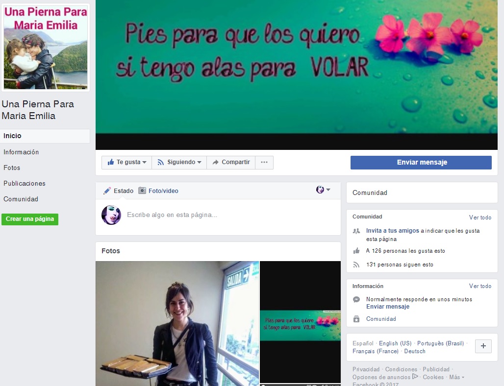 Actualmente lucha cada día por conseguir una pierna ortopédica. Hace unos días. Creo en Facebook una página llamada “Una pierna para María Emilia”. Según contó, hacen un mes inició los trámites en la Obra Social Provincia, hasta el momento con resultados negativos.