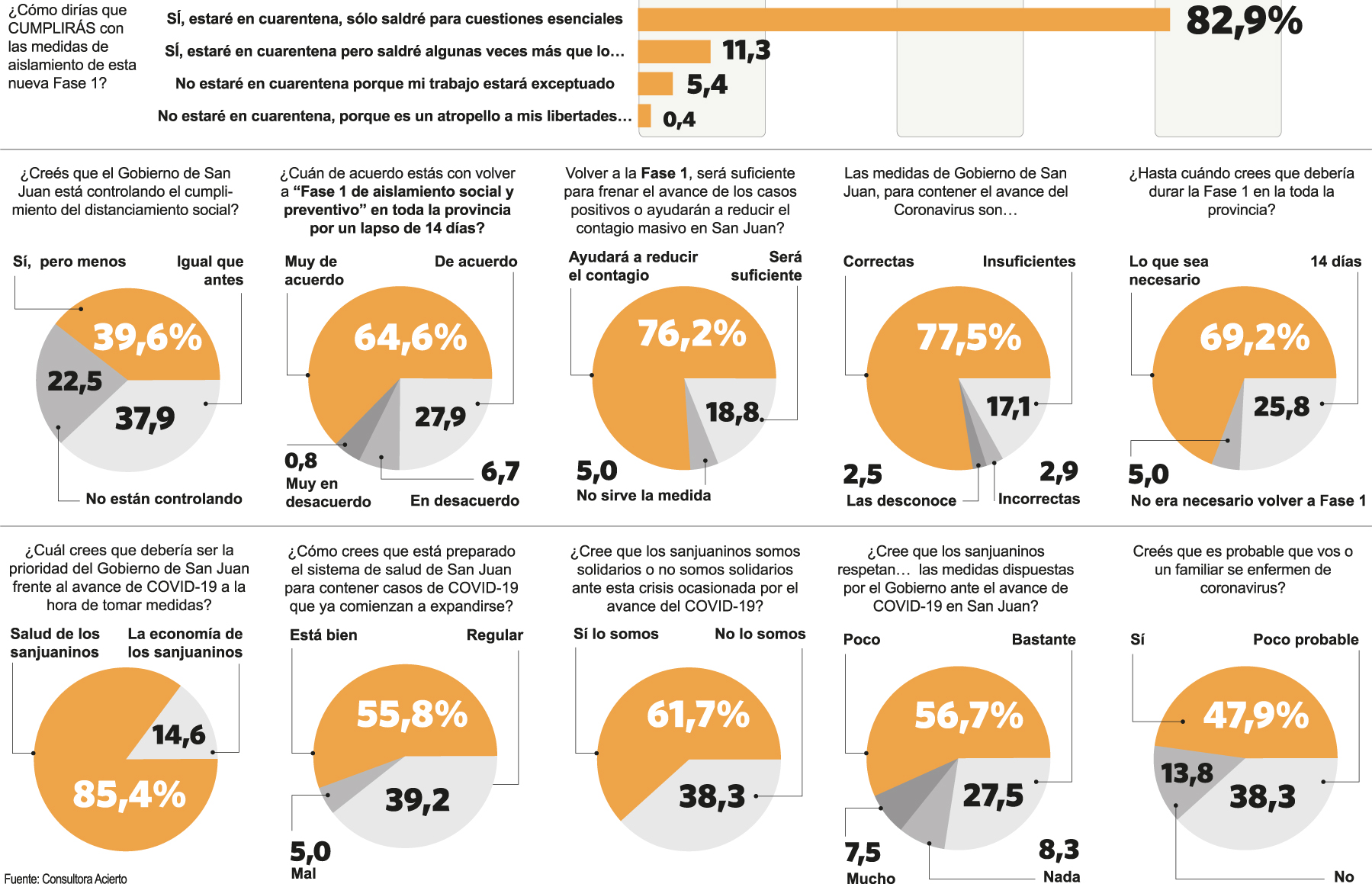 La encuesta realizada por la consultora Acierto también incluyó preguntas relacionadas a los controles y a la responsabilidad de cada ciudadano. En este sentido una de las preguntas fue: "¿Creés que el Gobierno de San Juan está controlando el cumplimiento del distanciamiento social?". Casi un tercio de los encuestados dijo que sí, pero hubo varios que dijeron "igual que antes" (37,9%) y la mayoría, "menos que antes" (39,6%). Mientras que otra de las preguntas fue "¿Cómo dirías que cumplirás con las medidas de aislamiento de esta nueva Fase 1?". Las personas que fueron encuestadas se mostraron dispuestas a acatarlas. El 82,9% dijo que estará en cuarentena y que sólo saldrá por cuestiones esenciales y el resto agregó que puede que salga algunas veces y otros que por diversas razones no estarán aislados.