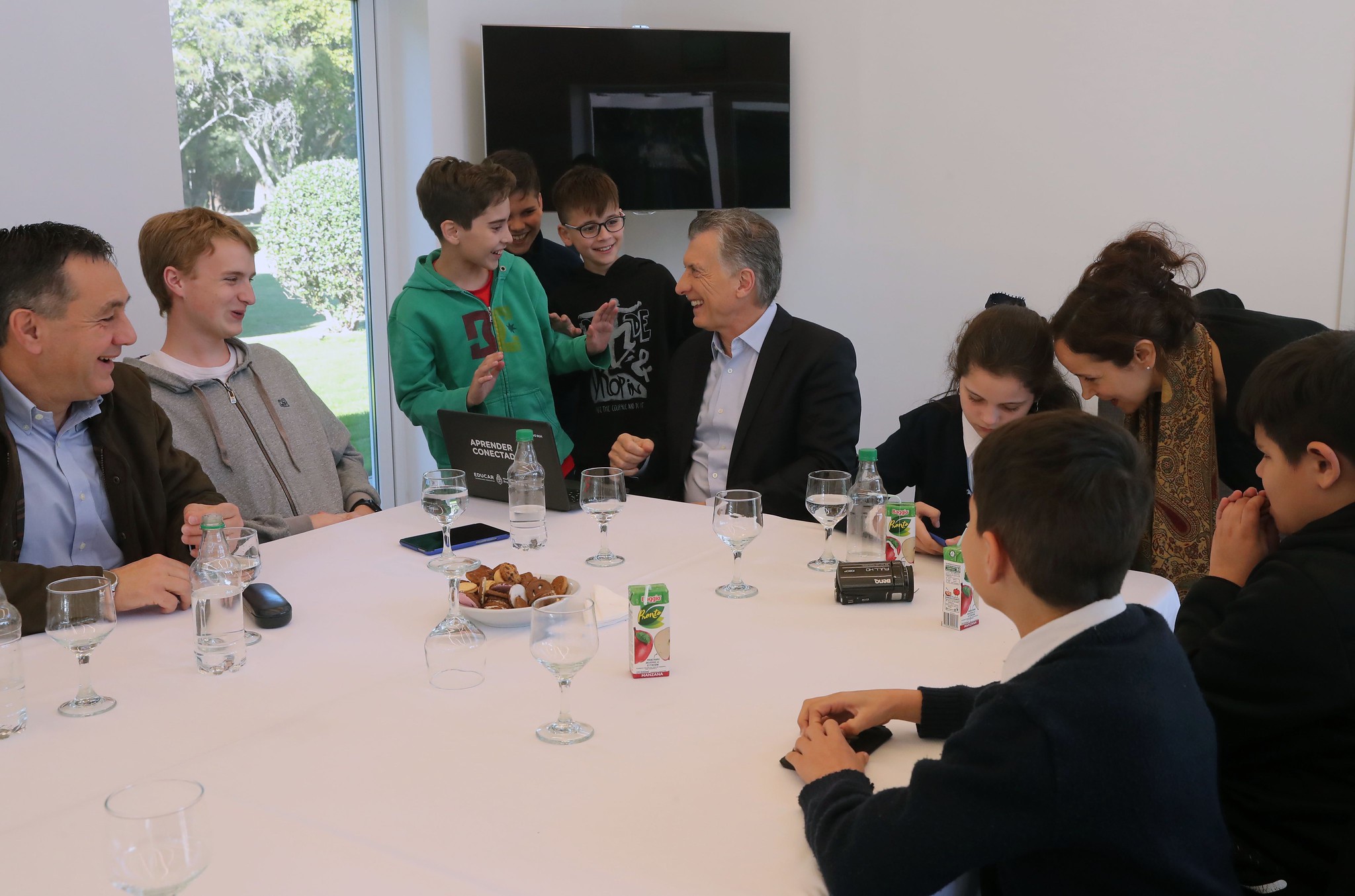 El encuentro fue en la Residencia de Olivos y el primer mandatario aprovechó la oportunidad para dialogar con los estudiantes sanjuaninos, quienes recibieron como premio equipamiento para futuros trabajos y un viaje de estudio a la Universidad de California, Estados Unidos.