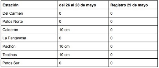 Del 26 al 28 de mayo se contabilizaron 10 cm de altura de nieve en las estaciones Pachón, Teatinos y Calderón. No obstante, la medición del día 29 de mayo señaló 0 cm.