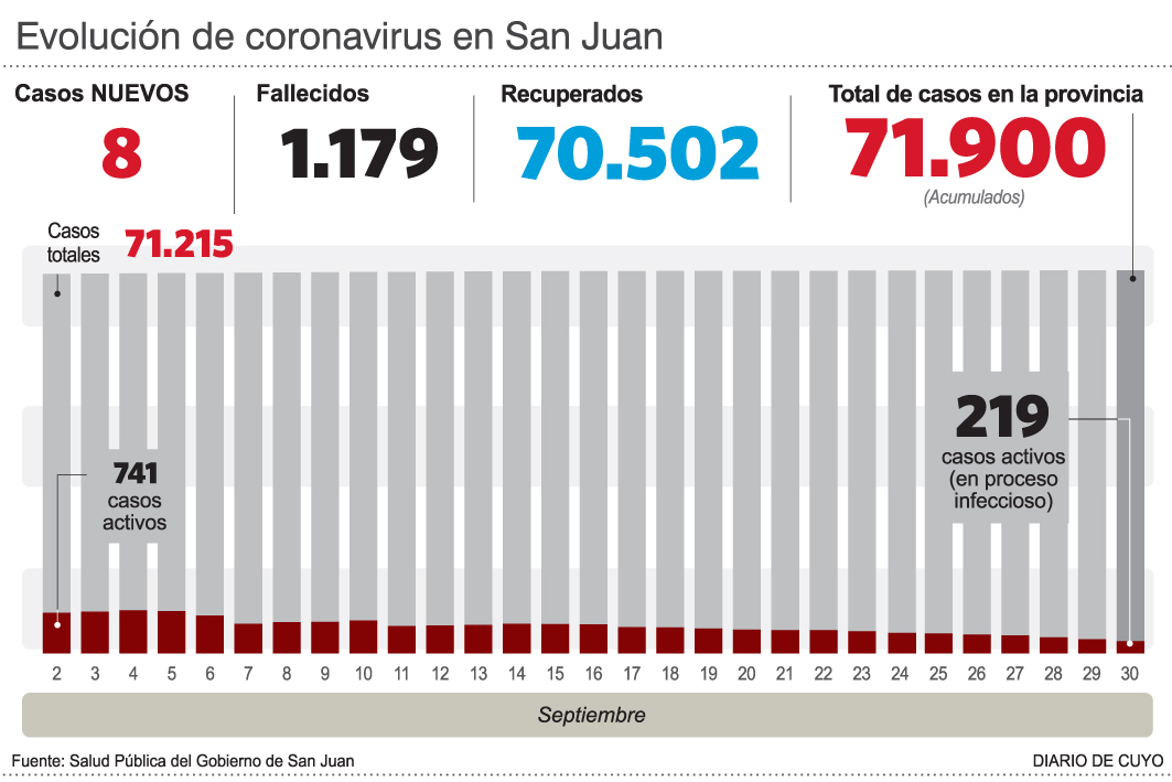 Por otro lado, lo que sucedió en septiembre tiene otra lectura y es que en lo que va de la peste (sin tener en cuenta el periodo previo al brote de Caucete) sólo dos meses habían totalizado menos de un millar de contagios, hace ya un año. Había sucedido en agosto de 2020, cuando hubo 262 infectados; y luego en septiembre, con 588 casos.