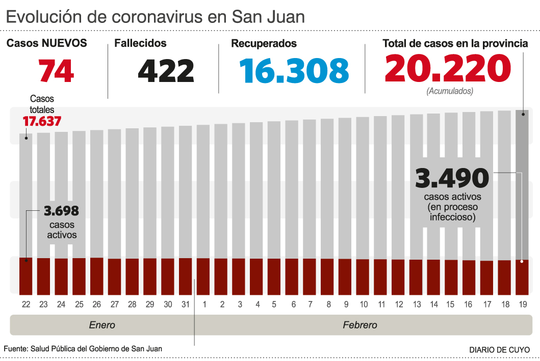 En tanto, como coletazo aún de los días de inactividad en los centros de testeos debido al fin de semana extra largo y también del descenso en la curva de contagios que se viene manifestando, las autoridades indicaron que detectaron 74 nuevos casos de Covid. De esta manera, el acumulado es de 20.220 personas.