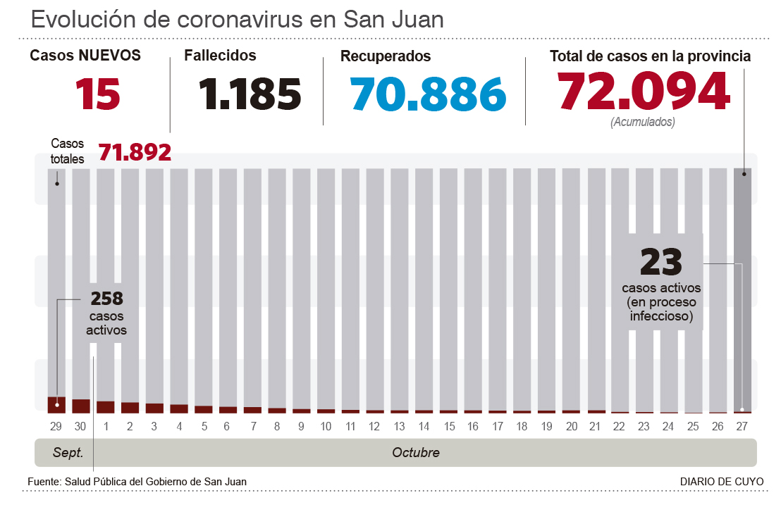 Salud Pública informó ayer otra leve suba de casos de covid, pues reportaron 15 entre 392 test, para un acumulado de 72.094 infectados. Sin nuevos decesos, el total se mantiene en 1.185; en tanto que los casos activos son 23. A su vez, hay 35 internados y de ellos, 12 permanecen en terapia intensiva.