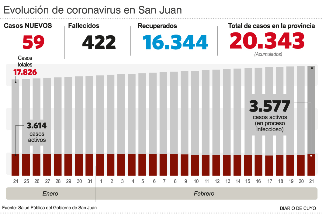 El parte que emitió el Ministerio de Salud Pública en el día de ayer, indicó que hubo 59 contagios nuevos, aunque ninguna persona fallecida por Covid-19 en la provincia. El de ayer fue el segundo día en el que la provincia no registra víctima fatales por el virus que azota al mundo. En lo que va del mes, se registraron 21 decesos, según las estadísticas del gobierno de San Juan.