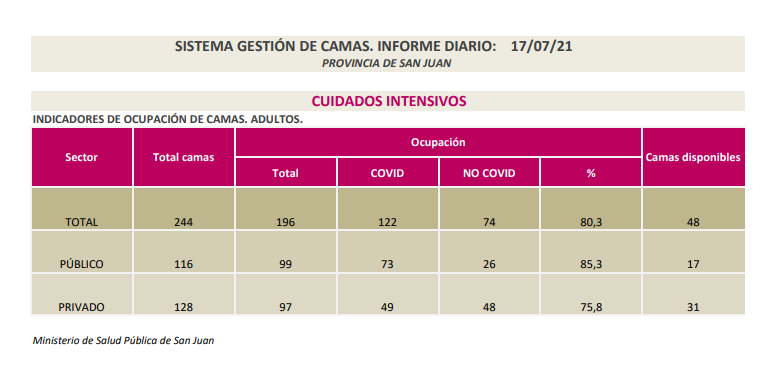 Salud Pública informó, que en las últimas 24 horas, la ocupación de camas en cuidados intensivos fue de 80,3%, entre el sector público y privado.