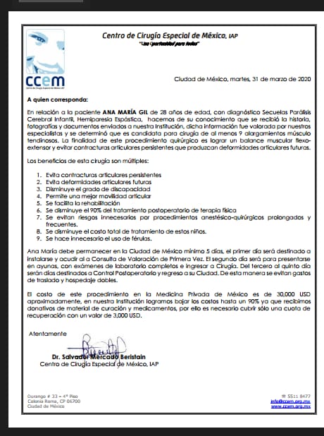 Actualmente, Ana María no consigue que ningún médico firme la orden de derivación para ser operada en la clínica mexicana que se especializa en cirugías para personas con secuelas de traumas neurológicos.