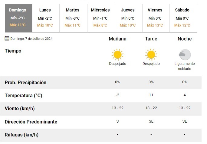 Según lo que indica el Servicio Meteorológico Nacional, para este domingo 7 de julio de 2024 se espera que la máxima ascienda hasta los 11°C mientras que la mínima caerá hasta los 2°C bajo cero.