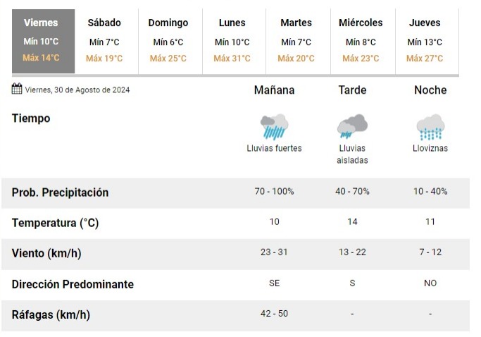 Según lo que indica el Servicio Meteorológico Nacional, para este viernes 30 de agosto de 2024 se espera que la máxima ascienda hasta los 14°C mientras que la mínima caerá hasta los 10°C.
