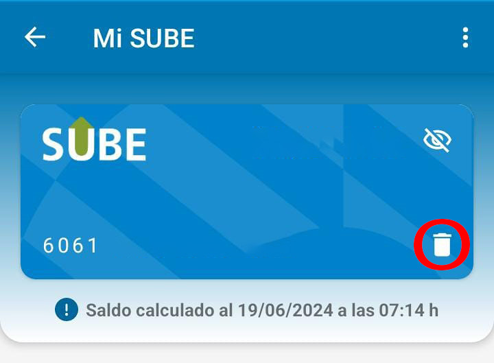 En la reciente app de SUBE, la forma más directa de dar de baja a la tarjeta es simplemente tocando el espacio de la tarjeta en la parte superior de la pantalla (que aparecerá con el número de la tarjeta registrada y el saldo correspondiente), y al acceder a esa opción, se puede darle de baja tocando el símbolo del tacho de residuos en el costado inferior derecho de la tarjeta en la pantalla. La aplicación mostrará tres opciones de motivos por las cuales hacer la baja, sea por rotura, pérdida o robo de la tarjeta.