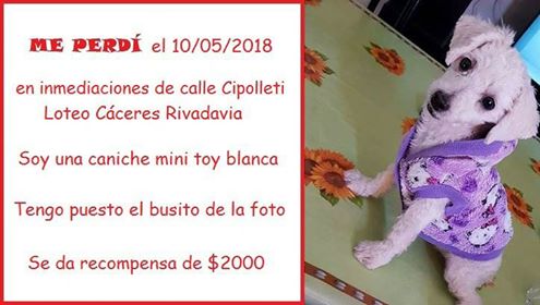 "Hola… ella es Dory se perdió este jueves en inmediaciones de calle Cipolletti, en el loteo Cáceres, Rivadavia. Se perdió en el horario de 16.30. Necesitamos que si alguien la vio o la encontró se comunique conmigo es una perrita muy querida. Estaba con el buzito de la foto. Muchas gracias!".