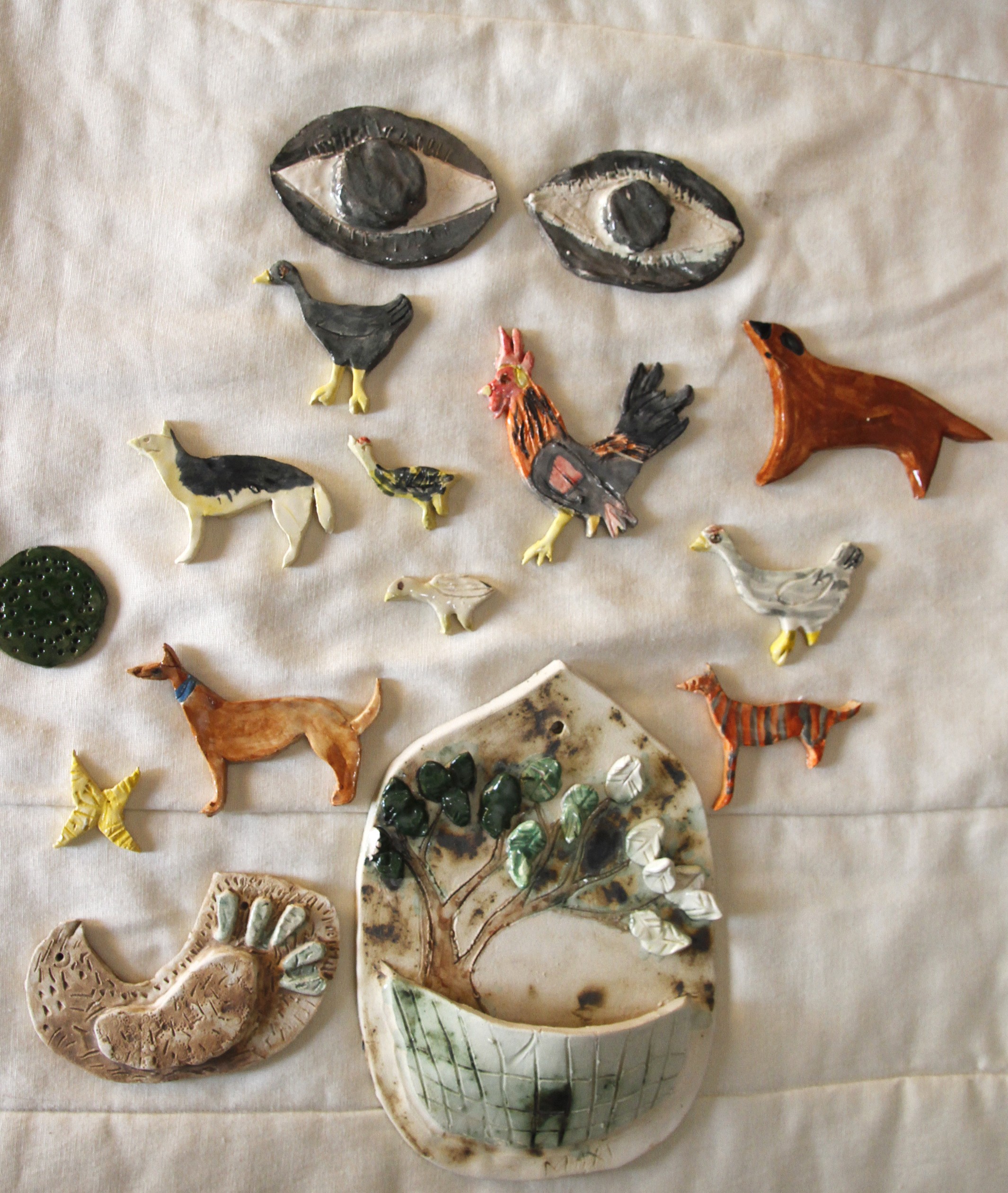 Allí van a estar el gallo Jacinto, Vanesa que es la "mamá gallina" de "La Tongolele y del Richard" (que se tuvo que mudar porque en el gallinero no había lugar para dos gallos) y la gallina blanca Estela y la negrita Florinda. También sus perros Bingo, Tina y Laura, que es un ejemplar atigrado de ovejero. Ya están listas las dos gatitas, algunos árboles, un dinosaurio, unos cuantos gorriones y un cóndor, un cactus, pájaros, los ojos de un cuento que leyó y quiso representar, entre otras figuras de adorno.