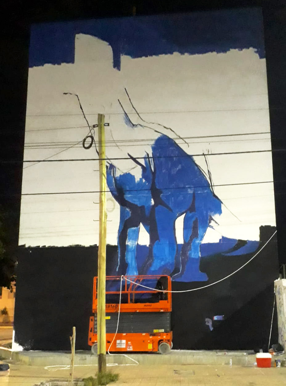 La semana pasada comenzaron a blanquear la pared, a proyectar la silueta que querían plasmar y luego a pintar sin descanso. No fue sencillo, ya que tuvieron que subirse a una grúa hidráulica para lograr el objetivo ya que la pared este de la escuela mide más de 16 metros de alto y unos 12 metros de ancho. En esta obra están involucrados Lucas Aguirre, dibujante, fotógrafo y como inquieto curioso de las nuevas tecnologías inmersivas, el "papá" de la criatura y por ende el coordinador y productor del proyecto, pero a su participó un grupo de artistas plásticos que se ocuparon técnicamente y le dieron color a cada detalle, entre quienes se puede nombrar a Maximiliano Heredia (que es quien además se ocupó de la proyección o mapeado sobre el muro), los experimentados en pintura hiperrealista Matías Alcaraz y Leandro Martín Molina y Fabio Pereyra, quien fue la mano derecha del conocido Mario Pérez. A la distancia, desde Buenos AIres, Fernando Maldonado, un experto en conjugar Artes Visuales con tecnología, fue quien hizo sus aporte para desentrañar la técnica de pintura con que se haría y colaboró con la realización del filtro (que está alojado en Instagram) y puede descargarse para tener otra experiencia con la observación del mural.
