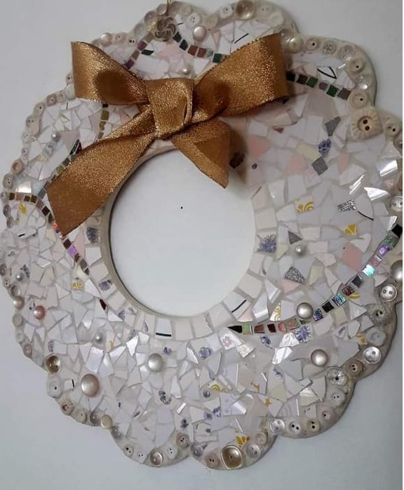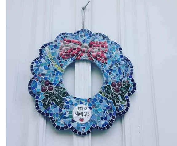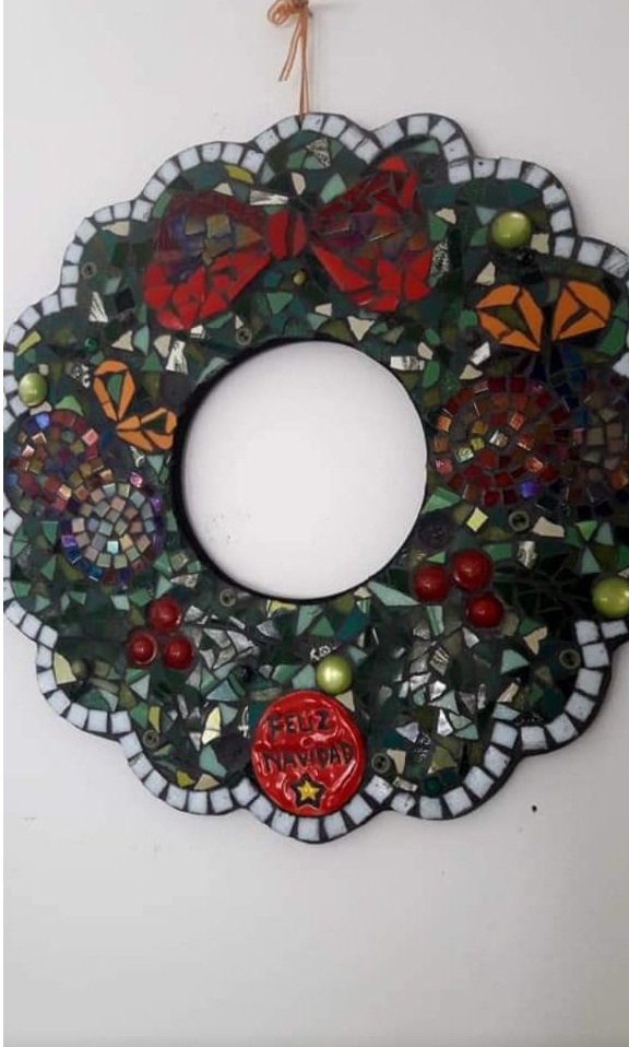 Hasta ahora se habían visto coronas navideñas de flores y ramaje natural, de tela, de plástico, de papel. Pero nunca de mosaiquismo. Hasta que Hebe Atencio, profesora de Artes Visuales que tiene su propio taller El Grito, decidió poner manos a la obra.