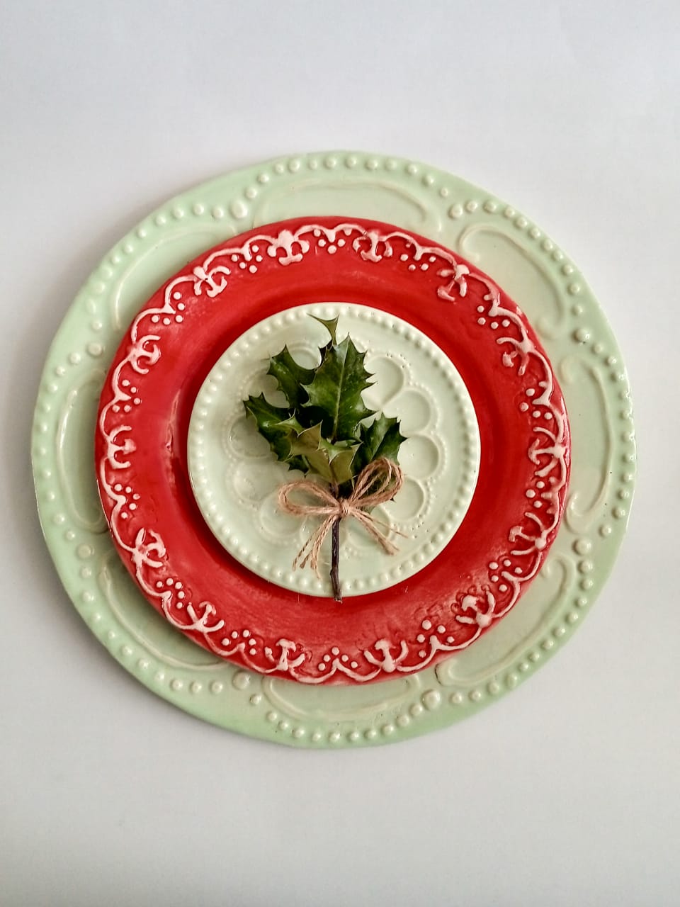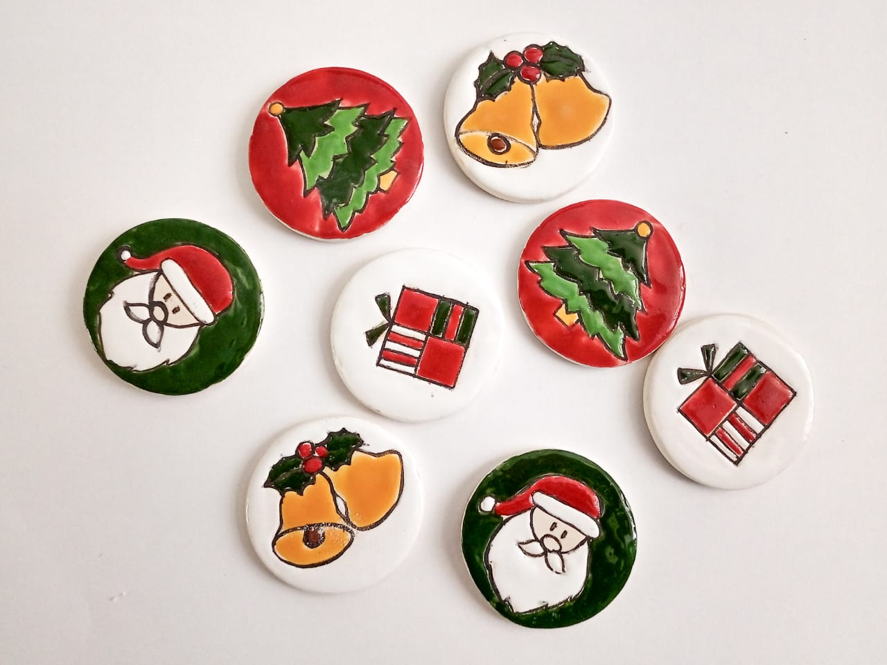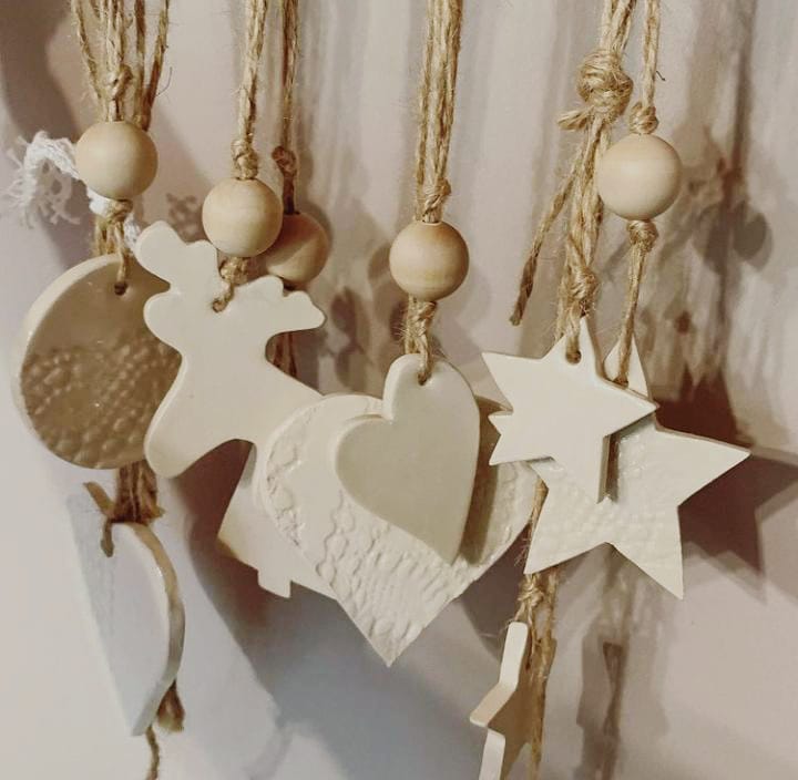 "Me encanta hacer piezas ilustradas en cerámica pero también objetos originales y modernos que van desde vajilla personalizada, poco convencional en su formas (irregular, con texturas, con relieve, labrados) y colores ya que por ejemplo no me ciño a los colores navideños sino que busco alternativas para combinar con platos blancos, negro o humo, las últimas tendencias. Hago desde platos de sitio, hasta bandejas, cazuelitas, tazas, juegos de vajilla completos. Además modelo arbolitos calados y piezas en base a una placa calada con la Sagrada Familia para iluminar, tocetos navideños para hermosear bandejas o para hacer tutores de plantas y hasta para identificar el lugar de cada comensal y "’, cuenta la artista que hace todo el proceso: amasado, modelado, torno, con planchas y calado, entre otras técnicas.