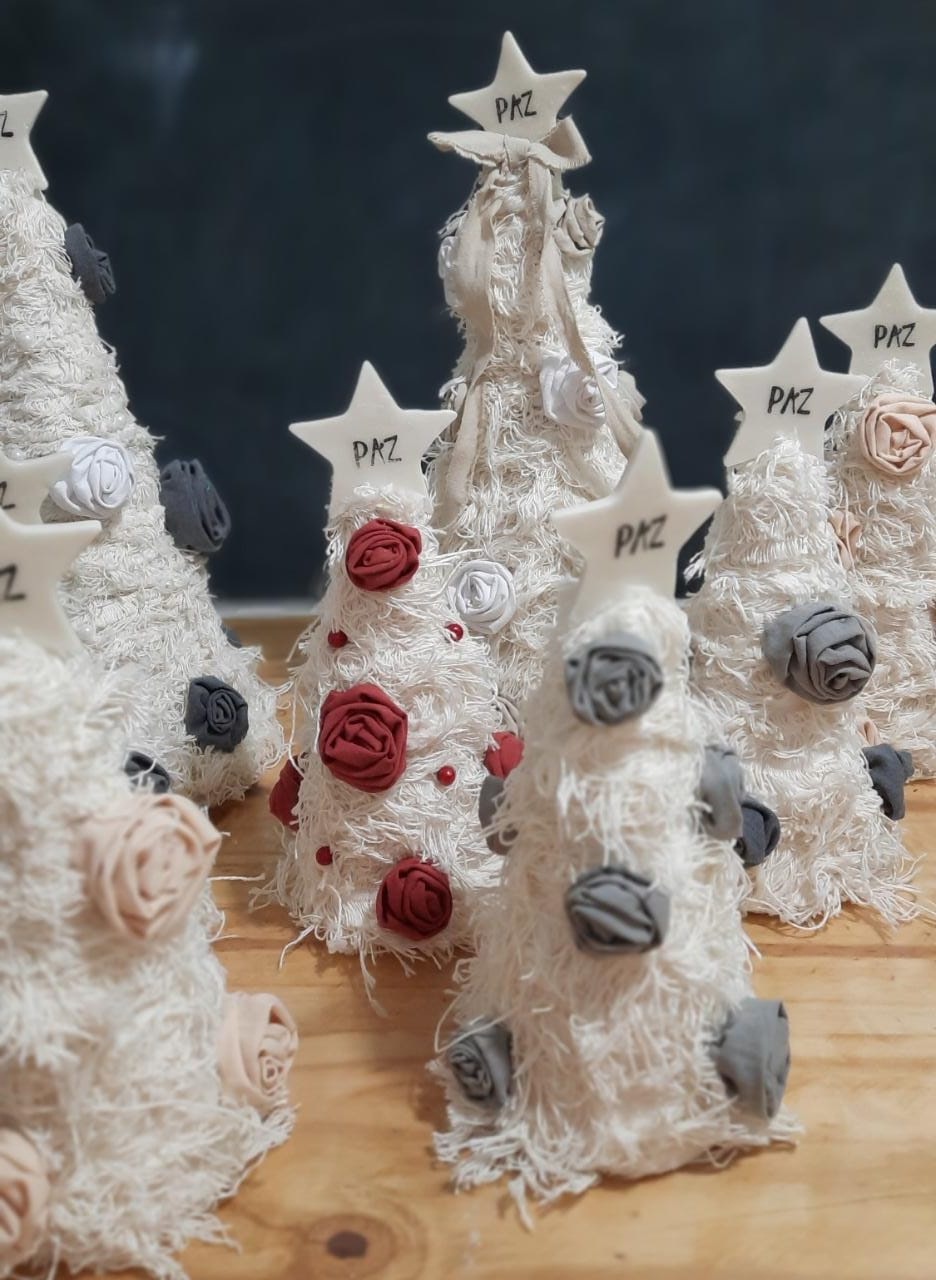 El trío para la Navidad del 2021 optó por enfocarse en un estilo nórdico para sus creaciones. Con telas que van desde el tusor y lienzos teñidos a mano, en tonos pasteles, terrosos y naturales, hacen magia, hasta convertirlos en coronas con flores (también hechas por ellas mismas) y moños de diferentes tamaños (el precio depende justamente de las dimensiones, entre los 1.500 y los 2.000 pesos) y por qué no pinos navideños desde los 25 a los 50 centímetros de alto que cuestan desde 1.000 a 2.500 pesos.