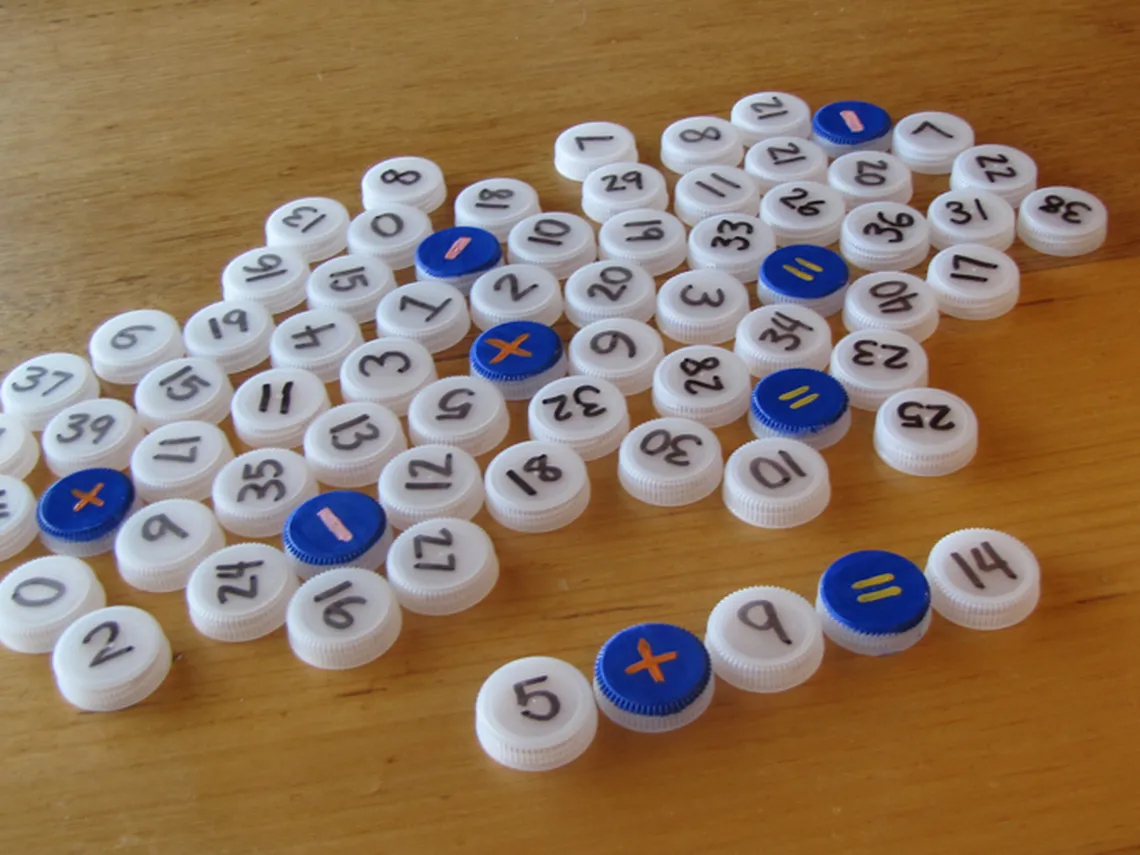 Lo más simple y didáctico del mundo. Dibuja un número del 1 al 20 en cada tapón y elige tres: uno para el símbolo de suma, otro para resta y otro para igual. Ahora empieza a hacer combinaciones y que aprenda por un buen rato. También podrás hacer competiciones entre amigos para ver quién consigue más.