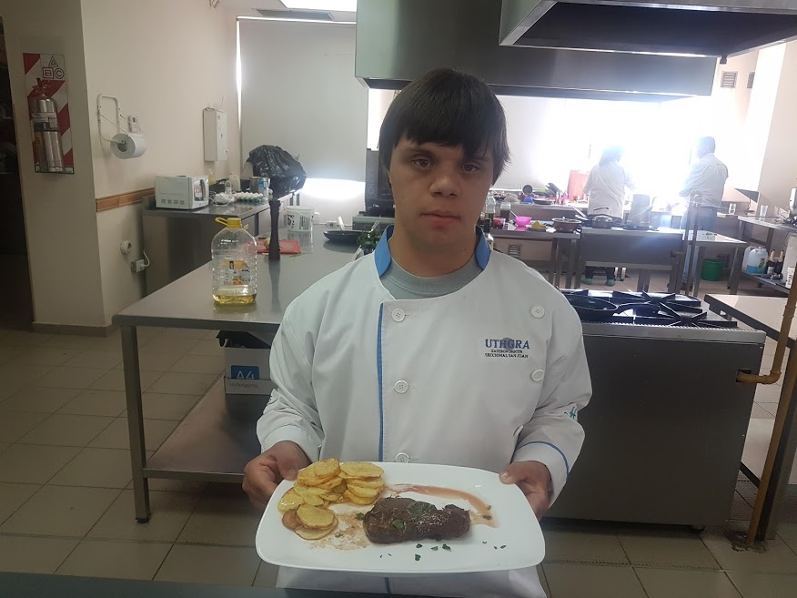 Juan Diego derribando prejuicios y mitos, transitó como un alumno más esta carrera terciaria. No tuvo ningún tipo de ayudas especiales o privilegios en los tres años de estudio por ser una persona con Síndrome de Down. Sólo requirió la colaboración de Valentina, su DAI (docente de apoyo a la inclusión) para repasar la teoría gastronómica aprendida. En Uthgra es uno más, lo define su profesor, Julio Cruz. "Por eso, debo reconocer que nos llena de orgullo su empeño y su buena mano para hacer platos deliciosos ”, agrega el docente que lo incentivó a no amilanarse para integrar equipos de cocina que participaran en concursos o en eventos. Tan es así, que este nuevo chef fue el ganador del grupo de cocineros que representó a la institución en el Argoliva.