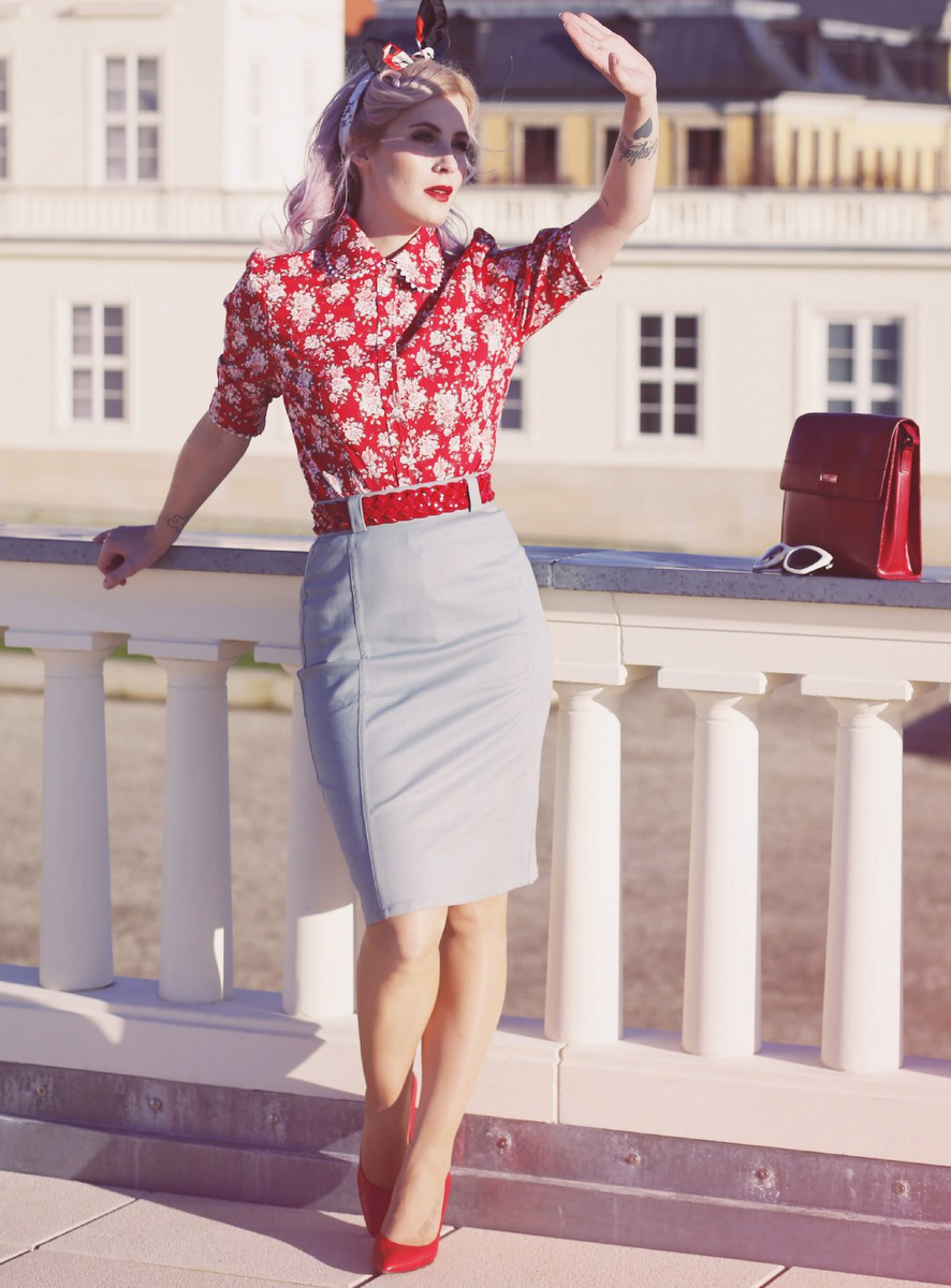 Trajes sastre con chaqueta de abotonadura doble; hombreras, estampados art deco o vichy, blusas con cuello redondo y las faldas acampanadas, polleras abotonadas adelante.