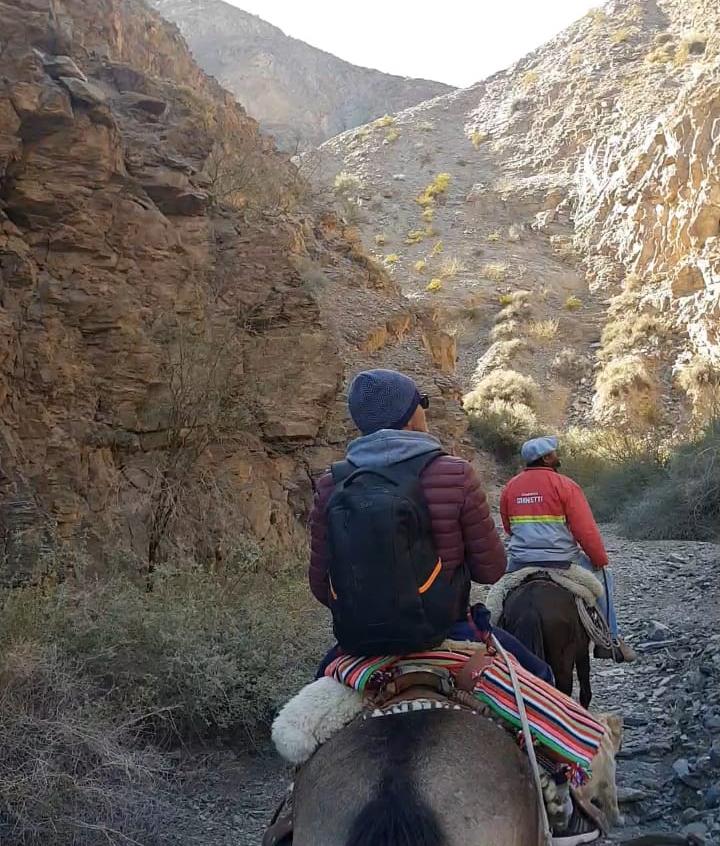 "El Cerro Pie de Palo tiene muchos lugares bellísimos para conocer: La Quebrada El Escondido donde hay piedras talladas por el agua, la Quebrada de La Pintada que se destaca por la existencia de pinturas o petroglifos indígenas, la Quebrada de la Ichona que es un lugar muy bonito, donde hubo hace muchos años desarrollo de la minería y aún hoy, aunque está abandonado, se puede entrar a las cuevas de dónde se sacaban el material. Otro lugar precioso son lo que llamamos los Hornos de Suárez, unas construcciones de piedra muy grandes que quedaron como resabios del trabajo minero de la cal, son ruinas de hornos y túneles muy antiguos. A algunas de esas partes se llega a caballo y luego, se sigue caminando y hasta escalando, lo que le agrega al recorrido mayor adrenalina y aventura. Ese recorrido dura 4 horas, por eso le damos la posibilidad a cada persona que elija adonde quiere ir", cuenta.