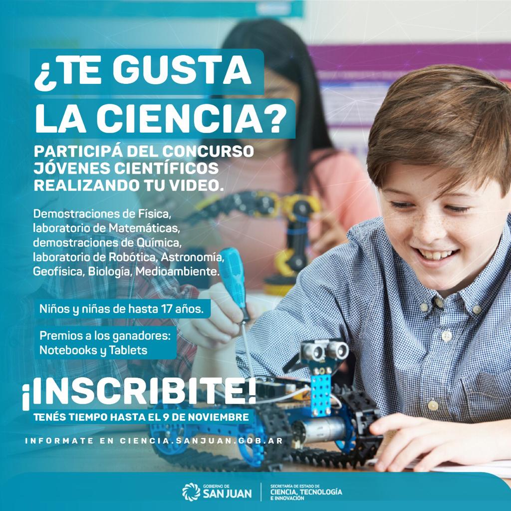 Si en casa hay algún niño, niña o adolescente “científico”, seguramente querrá participar. No queda mucho tiempo para la fecha de presentación del video, así que, manos a la obra. Para mayor información, ingresar a ciencia.sanjuan.gob.ar.