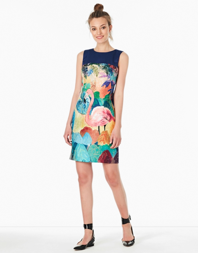Flamencos principalmente seguidos por guacamayos u otras aves multicolores.