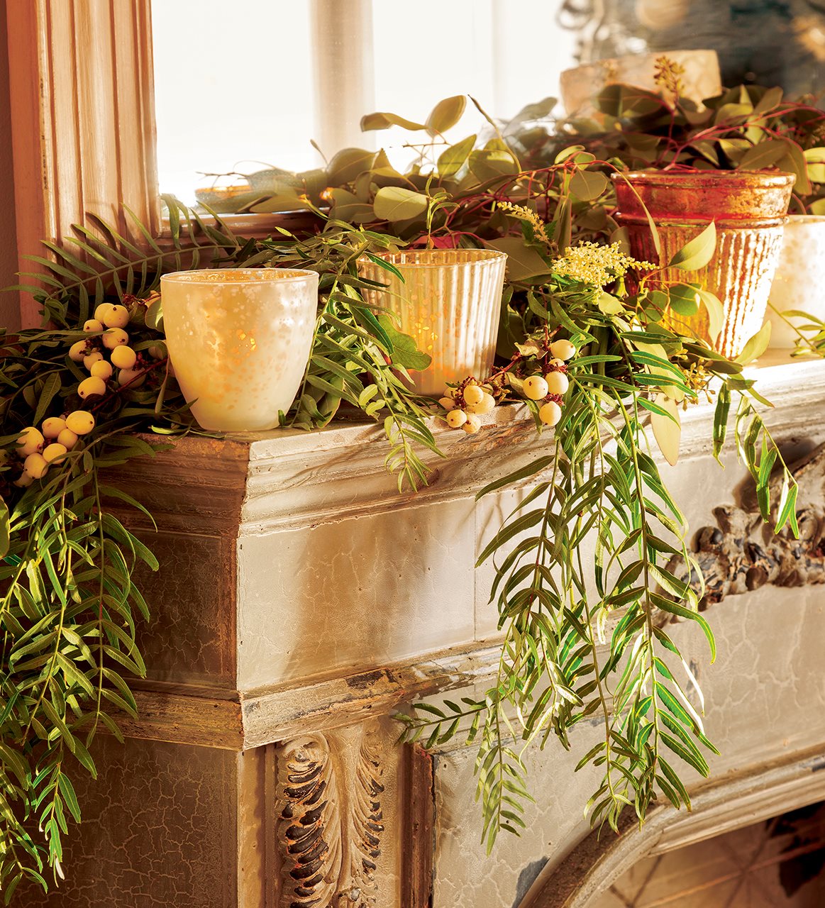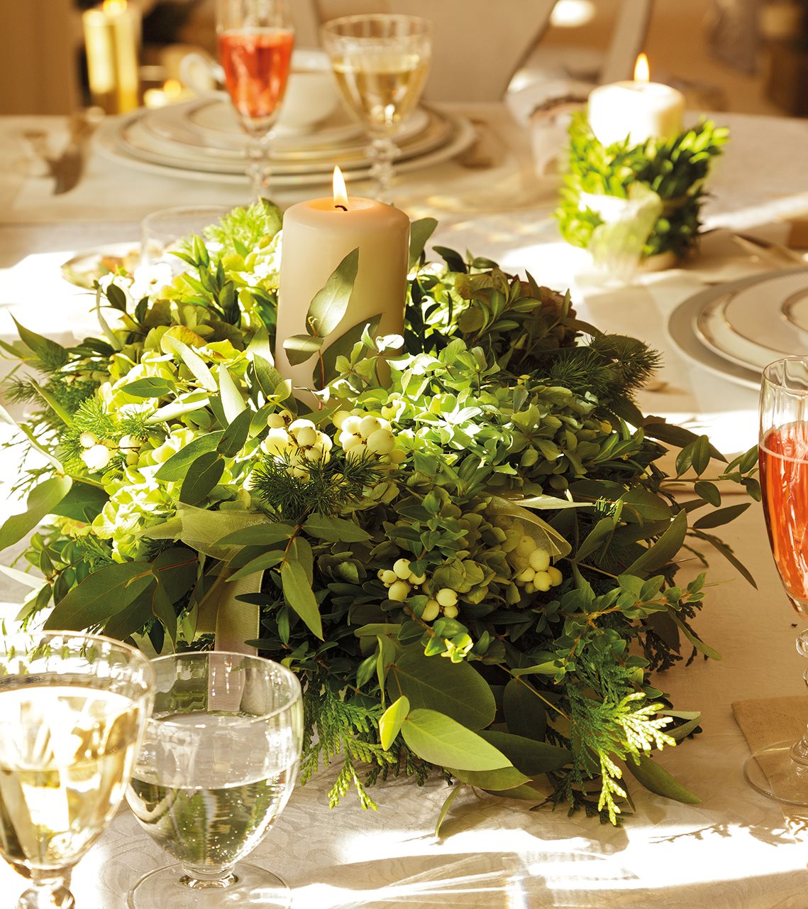 Rodea una vela alta con un poco de muérdago, hojas de pino, abeto o el arbusto que tengas en casa. Átalo con un cordel y pon el centro en una fuente para moverlo fácilmente.