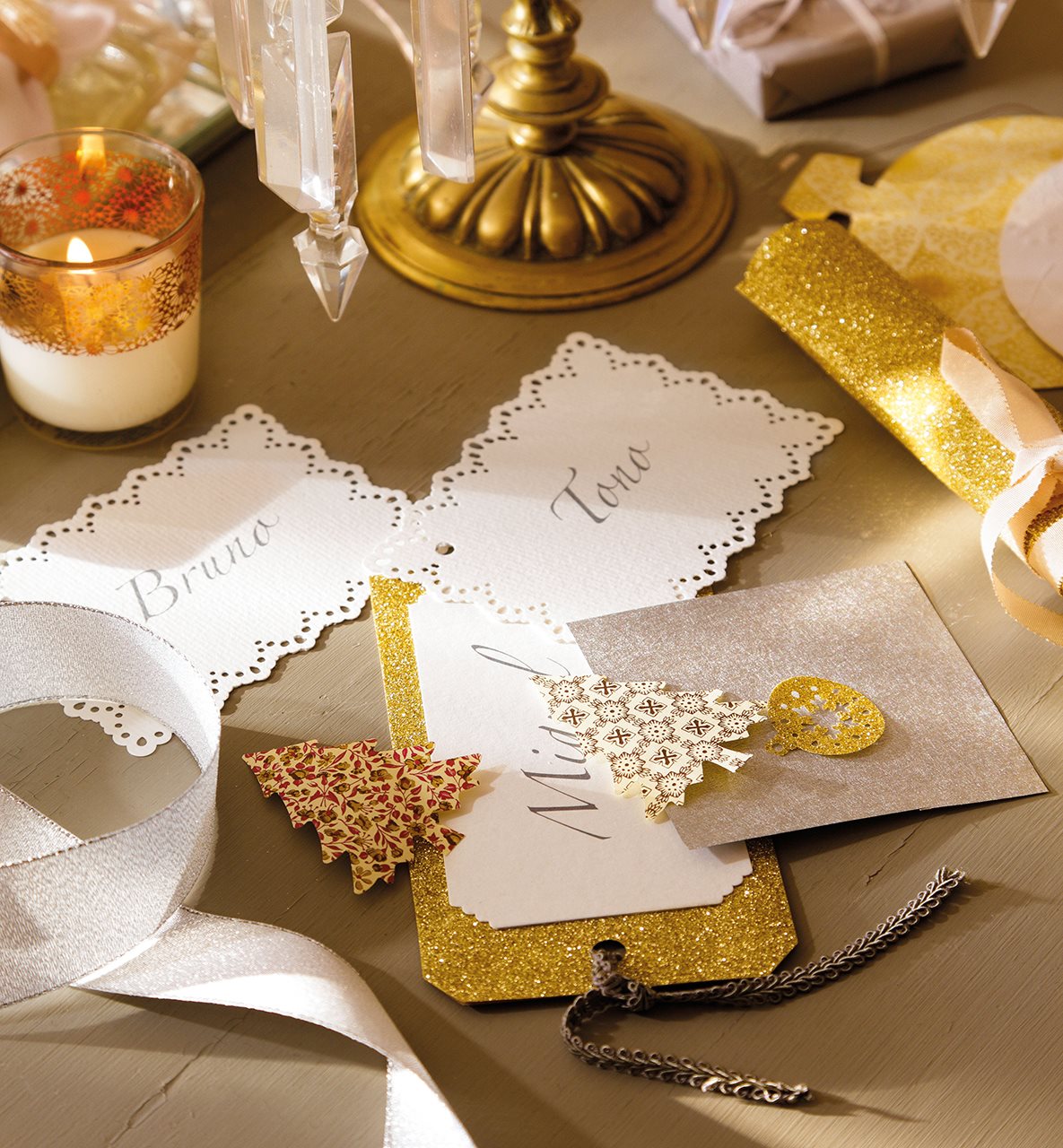 Con el nombre de tus invitados, dale forma a las tarjetas con un troquel de bordes y decora con cintas y papeles con algo de brillo.