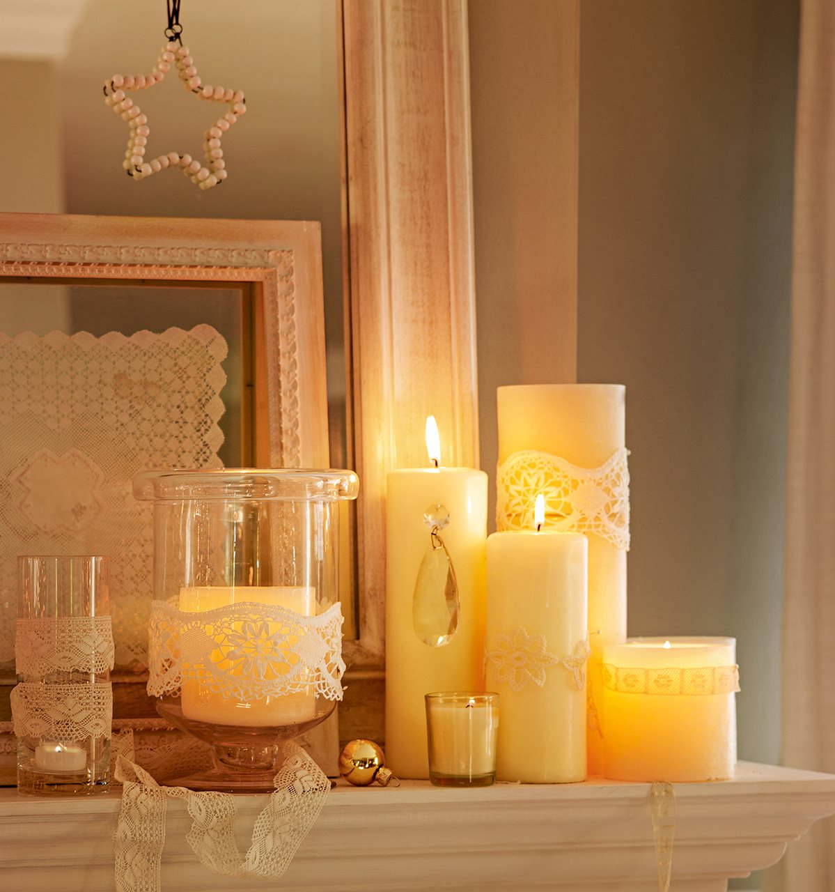 Añade un toque delicado a tus velas y objetos de cristal con puntillas y encajes. Fíjalos con pequeños alfileres y podrás reutilizarlos tras las fiestas. Otra opción, es utilizar cintas navideñas o bien con retazos de telas de colores.