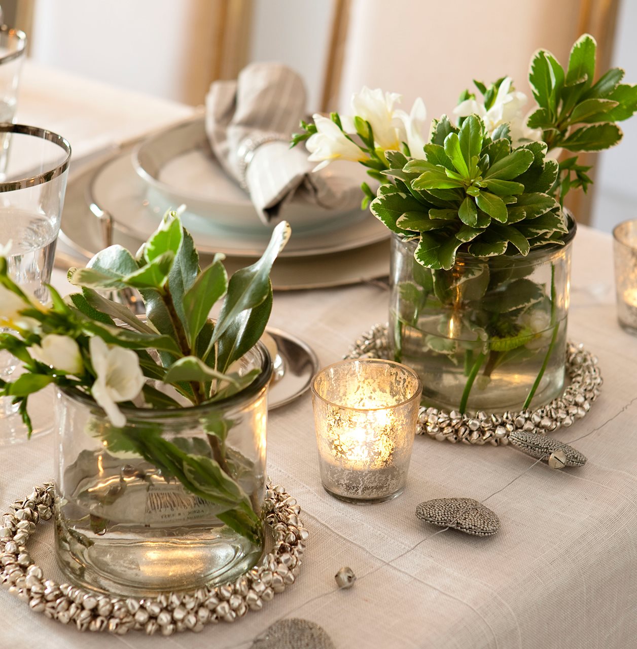 Haz pequeños centros florales utilizando vasos de boca ancha en lugar de jarrones. Con un ramillete de hojas verdes y alguna flor queda listo. También puedes colocar velas pequeñas en vez de ramas verdes.