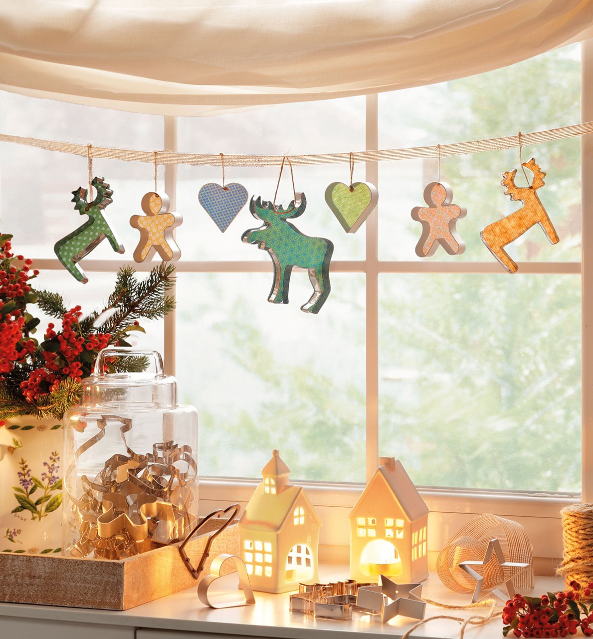 Dibuja el contorno de cada molde en un papel, recórtalos y pega cada silueta al molde. Haz un agujero para pasar un cordel y cuélgalo de la guirnalda.