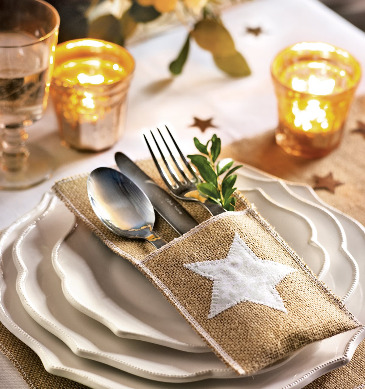 Haz pequeños saquitos con tela de saco para presentar los cubiertos a la mesa. Cose en la parte frontal un retal en forma de estrella, árbol, u otro detalle, por ejemplo un moño.