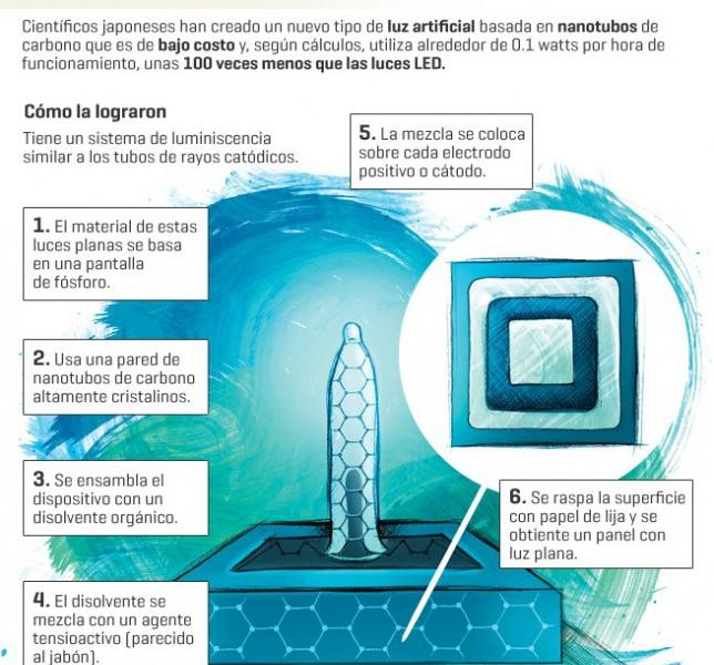 Las iluminación con LED quedaría en el pasado luego del invento de un equipo de científicos de la Universidad de Tohoku (Japón). Según afirman, lograron superar esa tecnología con un nuevo tipo de fuente de luz plana fabricada con nanotubos de carbono, extraordinariamente eficiente y con muy bajo consumo de energía: alrededor de 0,1 vatios por cada hora de funcionamiento, es decir, cerca de un centenar de veces menos que las LED señala Energía Limpia XXI.