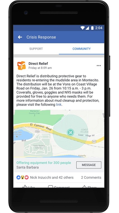 El 8 de febrero de 2017, Facebook anunciaba su Community Help, un servicio en el que permitía a los individuos ofrecer alimentos, agua o refugio a otras personas en situaciones de crisis. La función era una actualización de otro servicio de esta clase que la red social había puesto en marcha en 2014, llamada Safety Check.